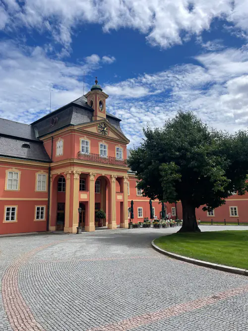 🟢 Vyražte po zelené kolem muzea okruhem k zámku Dobříš. Můžete se pokochat nádvořím, vstup do francouzské zahrady a dovnitř zámku je zpoplatněný.