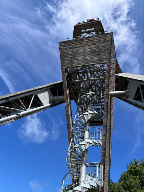 🔭Rozhledna je sama o sobě architektonicky zajímavá, má unikátní podobu dvou do sebe zaklesnutých sedmiček a vznikla díky architektonické soutěži podle vítězného návrhu ing. arch. Jana Smékala. V okolí rozhledny posedíte na lavičkách, jak jinak než ve tvaru sedmičky.